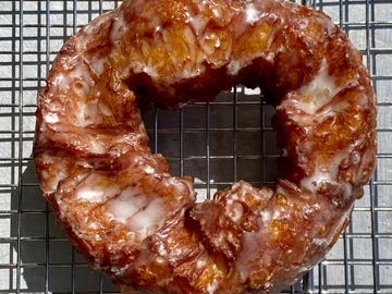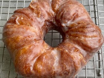 We make a French cruller with an enriched pate choux, a classic French dough/batter that is used to make cream puffs and eclairs. The exterior is delicate, occasionally crackly, and a deep golden brown, while the interior is both decadent and ethereal. The cracks and crevices in the surface of the Cruller are perfect for capturing glaze, while the moist interior has a flavor reminiscent of vanilla pudding to create an unforgettable doughnut experience.