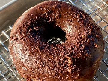 Not many doughnut shops are willing to tackle a yeast leavened chocolate doughnut. When we opened Curiosity Doughnuts we knew that we had to have one on the opening menu. Our Chocolate Yeasted Doughnut has an intense chocolaty flavor with hints of coffee and vanilla, making it taste balanced and robust, still, with the exceptional richness and light texture of the vanilla yeasted doughnuts